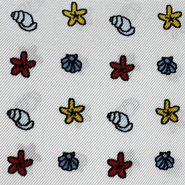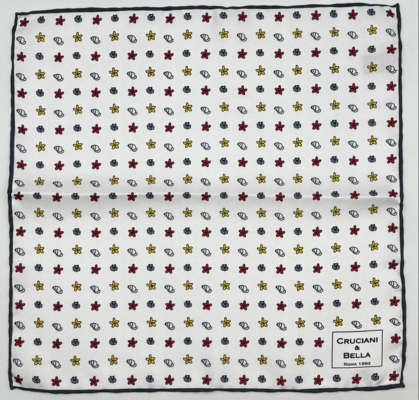 Cruciani & Bella - Silk - White, Red, Yellow and Light Blue Sea Motif Pocket Square #10069